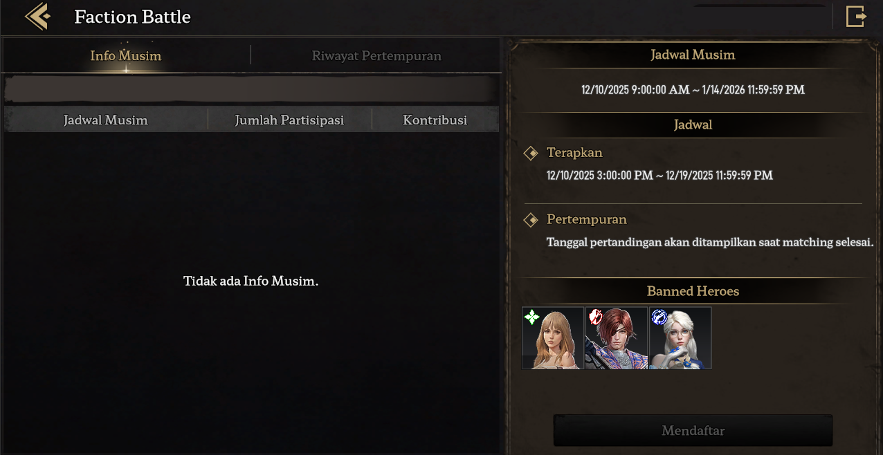 - Bagi pionir yang masuk ke Faction yang berpartisipasi dalam Faction War di pertengahan musim, pionir tidak dapat berpartisipasi dalam War dan tidak bisa mendapatkan hadiah.