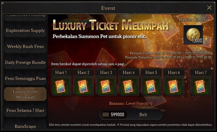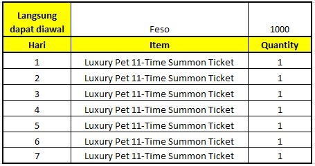 Kamu akan mendapatkan Luxury Pet 11-Time Summon Ticket setiap harinya selama 7 hari, dan diawal pembelian kamu juga akan langsung mendapatkan 1000 Feso.
