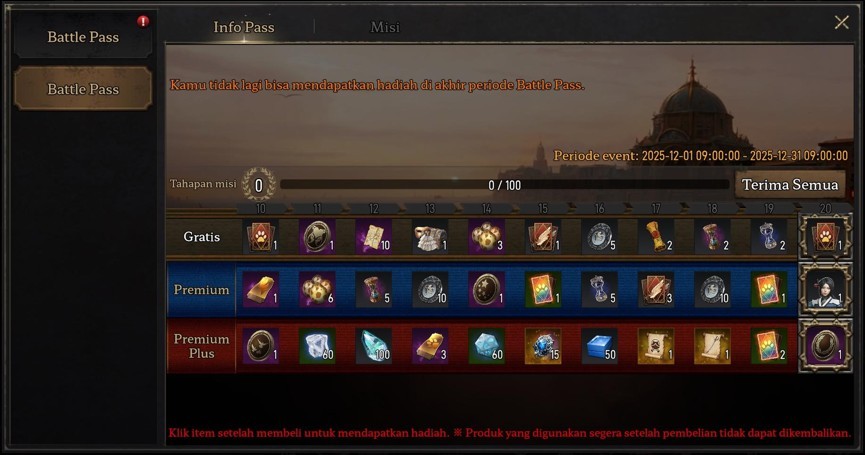 Dalam Battle Pass terbaru, tersedia berbagai macam item yang dapat kamu peroleh, mulai dari kategori Free, Premium, hingga Premium Plus. Setiap item tersebut dapat dikumpulkan dengan menyelesaikan misi-misi yang telah disediakan, sehingga memberikan pengalaman progres yang lebih terstruktur dan bermanfaat.