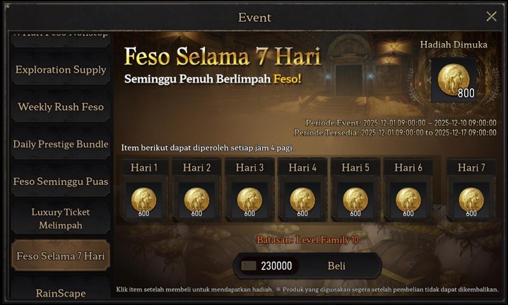 Kamu akan mendapatkan Feso setiap harinya sebesar 600 Feso, dengan total Feso yang akan kamu dapatkan 4.200 Feso, dengan tambahan 800 Feso. 800 Feso ini akan kamu dapatkan langsung diawal pembelian.