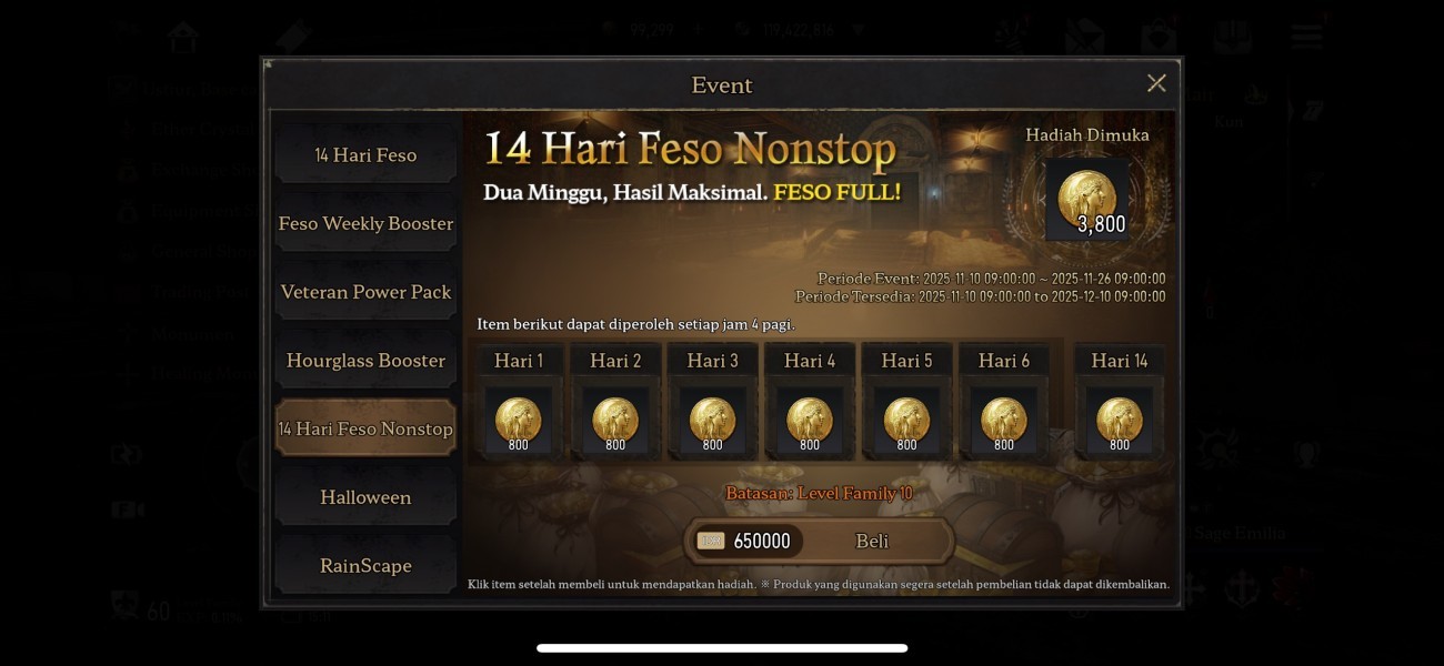 Jangan lewatkan kesempatan emas dari Event 14 Hari Feso Nonstop! Selama dua minggu penuh, kamu bisa mengumpulkan Feso dalam jumlah maksimal untuk mempercepat progres Family-mu. Total 15.000 Feso bisa kamu dapatkan dari sini!