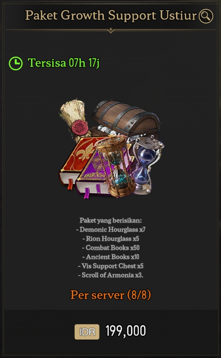 Perjalananmu akan semakin lancar dengan hadirnya paket Growth Support Ustiur. Paket yang berisikan item-item penting yang mempercepat progresmu. Berikut isi dari paket tersebut: