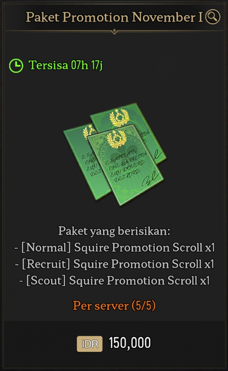 -[Scout] Squire Promotion Scroll sekarang bisa dibeli sebanyak 3x di setiap minggu dengan harga 1000 Feso