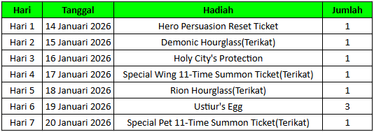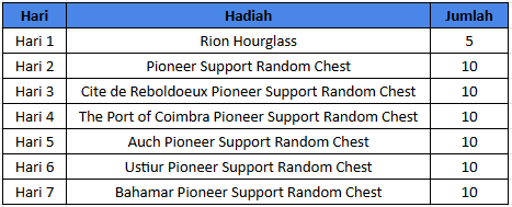 Pionir akan mendapat Demonic Hourglass 5x setelah membeli paket ini. Selanjutnya, pionir bisa mengklaim hadiah harian item exploration dengan detail di bawah ini.