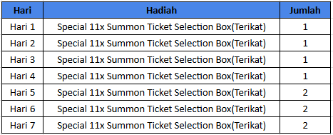 Beli paket ini dan dapatkan 500 Feso secara langsung. Pionir juga akan mendapat hadiah harian dengan total 10 summon ticket dengan detail dibawah ini!