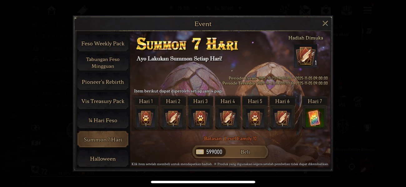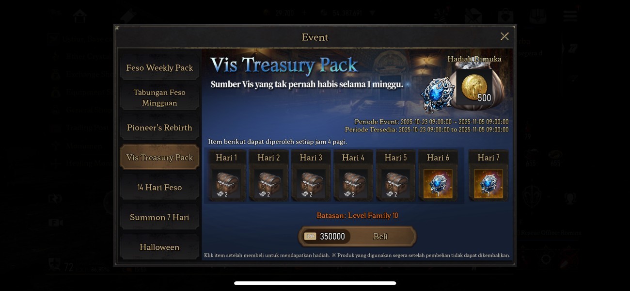 Selama 7 hari, Vis mengalir tanpa henti. Dapatkan Vis Treasury Pack dan nikmati pasokan vis yang stabil untuk mendukung setiap langkah di medan pertempuran.