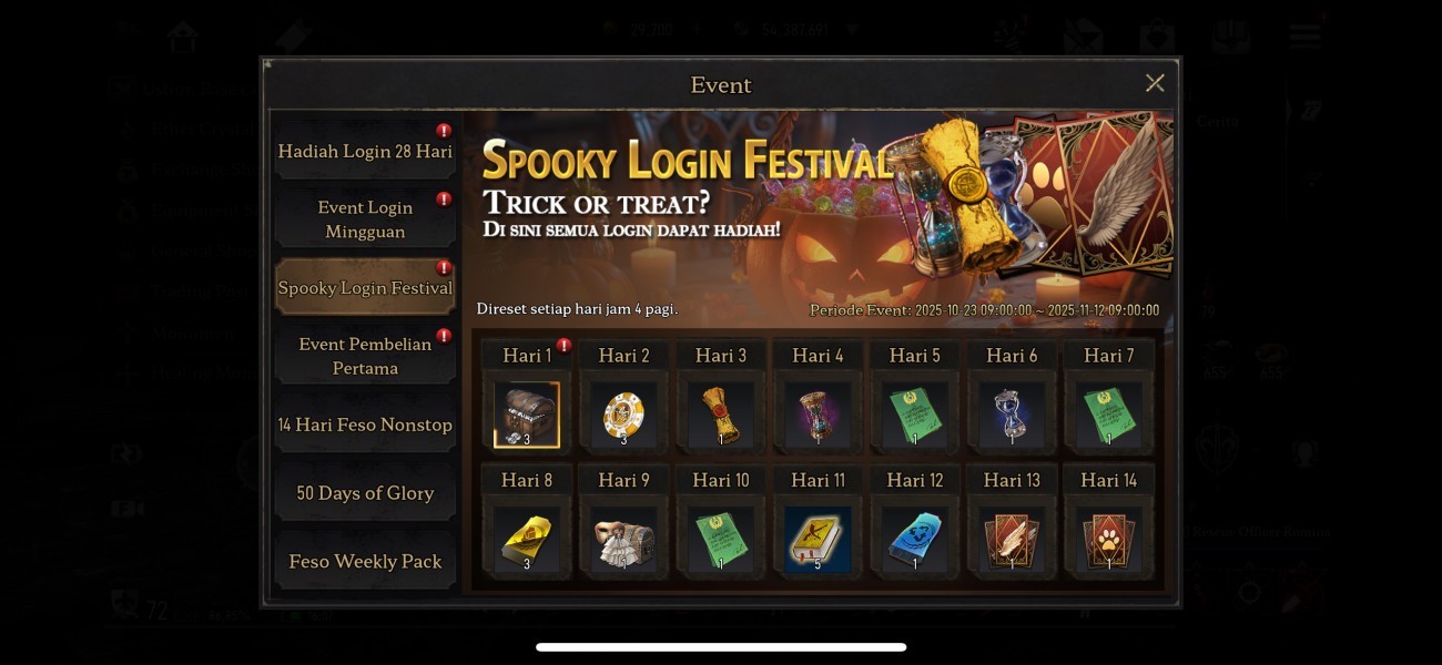Trick or treat? Rayakan momen seru di Spooky Login Festival!. Cukup login selama periode event, dan hadiah langsung menanti.