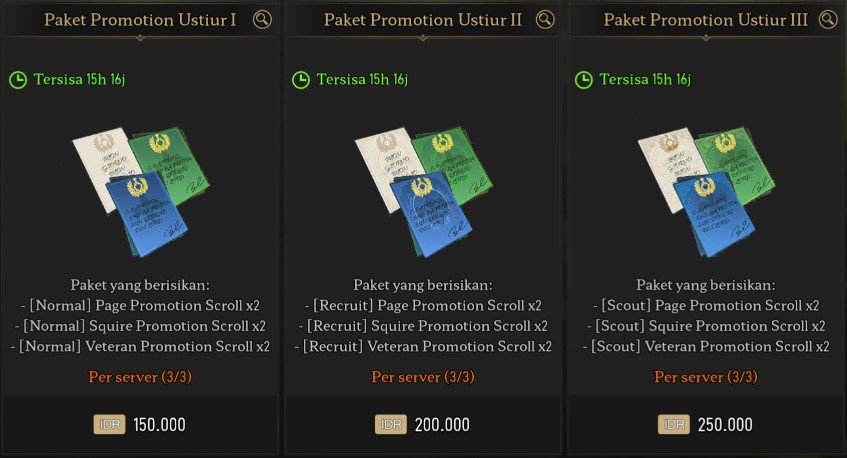 Paket promotion ustiur dirancang khusus untuk para pionir menjelajahi benua baru ustiur. Tiga paket eksklusif telah disiapkan, masing-masing berisi item pilihan dengan nilai maksimal.