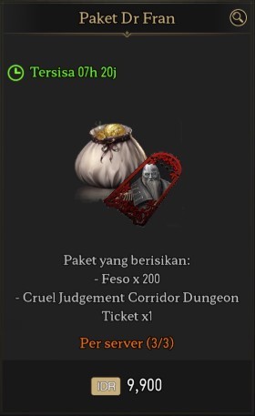Paket ini berisikan 200 Feso dan Cruel Judgement Corridor Dungeon Ticket x1