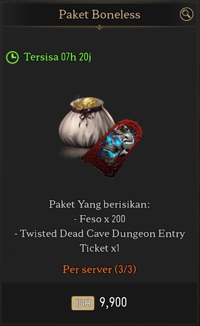 Paket ini akan memberi pionir 200 Feso serta Twisted Dead Cave Dungeon Entry Ticket x1 dari Raid Dungeon terbaru!
