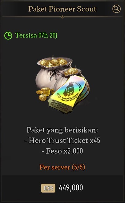 Paket yang akan menghadiahkan 45 Hero Trust Ticket dan 2000 Feso kepada pionir.