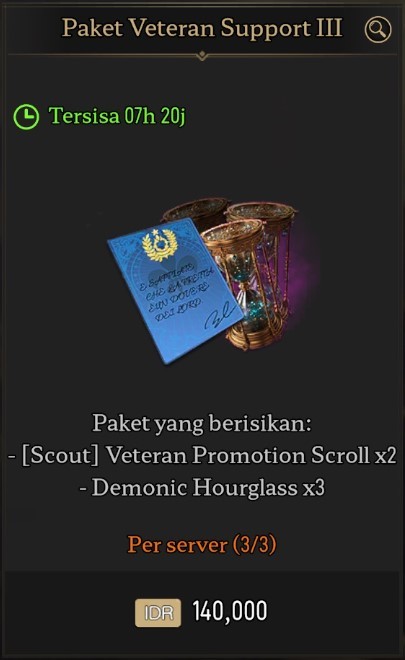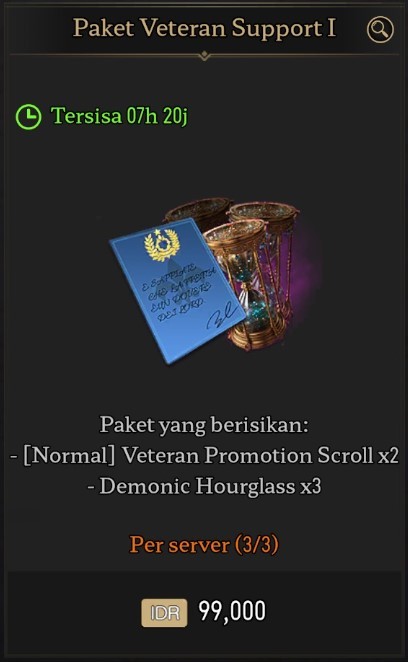 Paket yang berisikan [Normal] Veteran Promotion Scroll 2x dan Demonic Hourglass 3x.