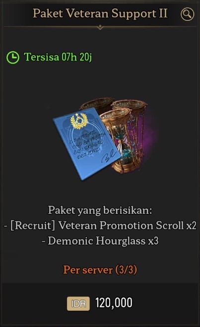 Paket yang berisikan [Recruit] Veteran Promotion Scroll 2x dan Demonic Hourglass 3x.