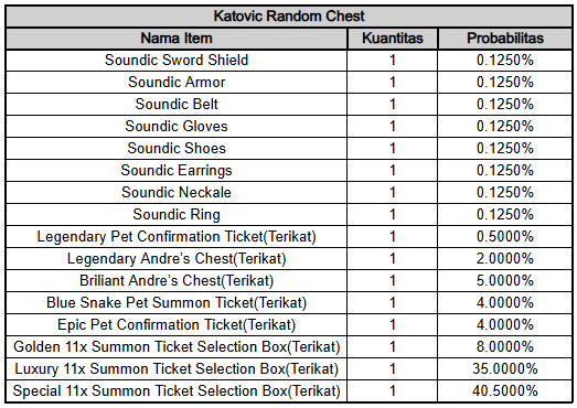 Untuk menyambut region baru: Katovic, akan ada item spesial untuk boost kekuatan Family kamu: Katovic Random Chest! Sebuah kesempatan emas untuk kalian bisa dapatkan item Mythic Soundic dan juga summon ticket yang sangat berlimpah. Berikut detail rate & stat-nya: