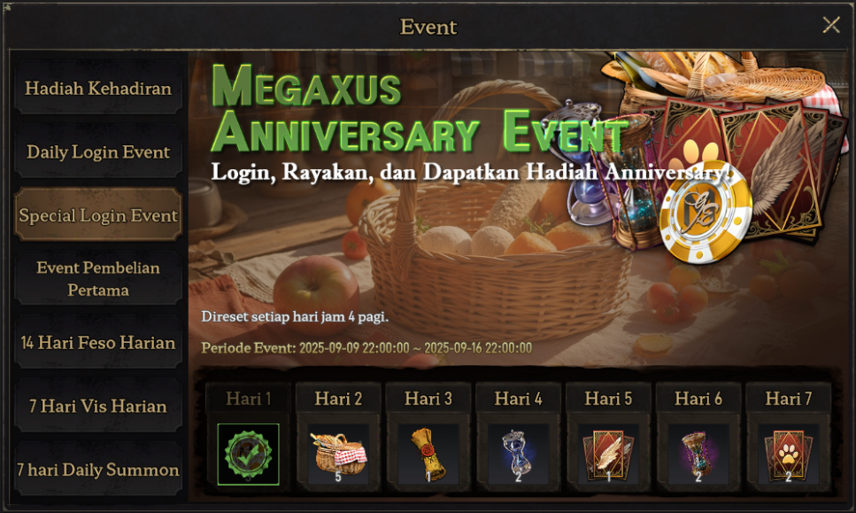 Rayakan momen spesial Anniversary Megaxus dengan hadiah luar biasa hanya dengan login setiap hari.ย Dapatkan hadiah berupa Enchant Chip, Food Set, Holy City Protection, Rion Hourglass, Demonic Hourglass, Special Pet & Special Wing Summon Ticket!